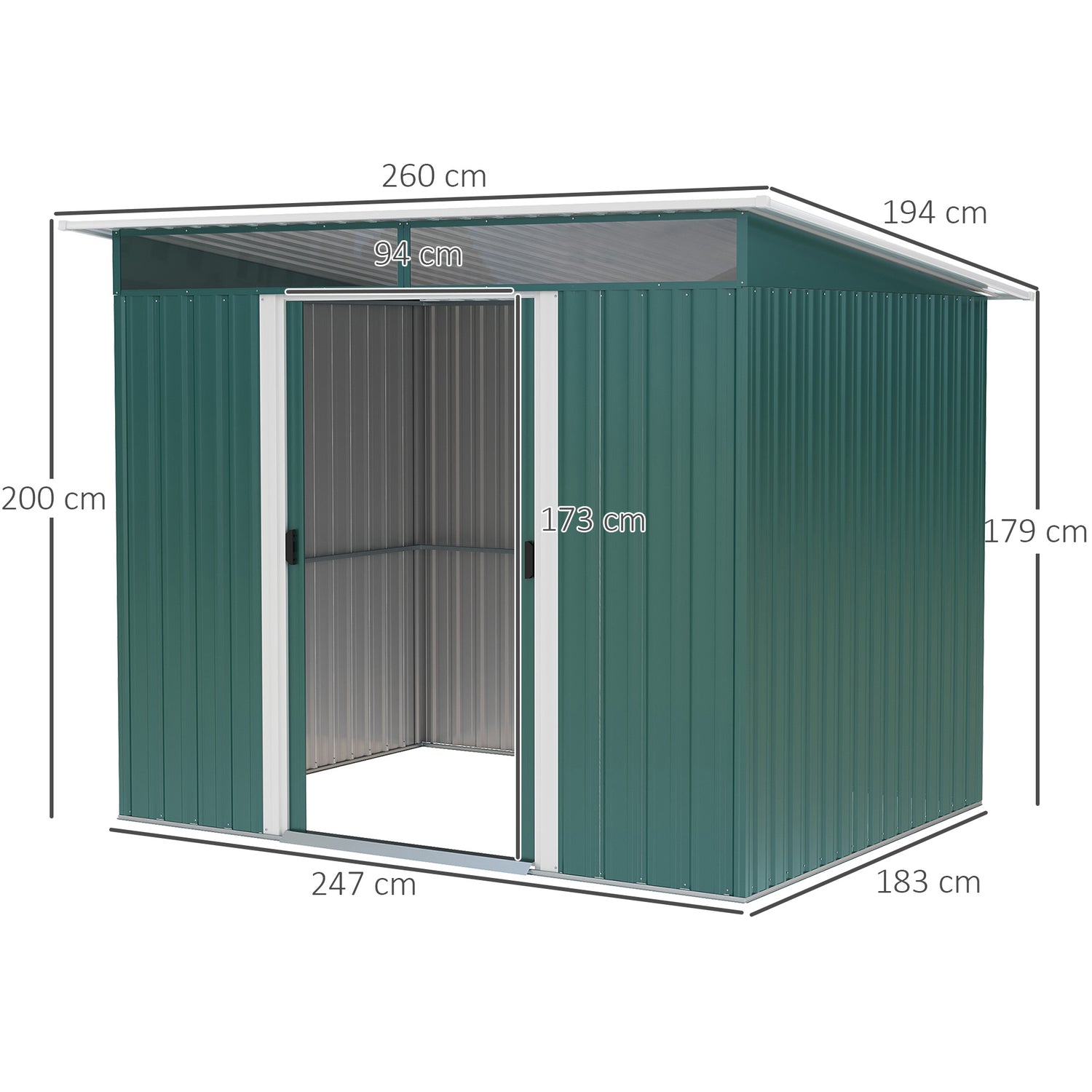 - Dimensions: 260L x 194W x 200H (front)/179H (back) cm. Door: 94W x 173H cm. Three people required for installation in approx. four hours - ALWAYS wear gloves. Do not build during windy weather conditions.