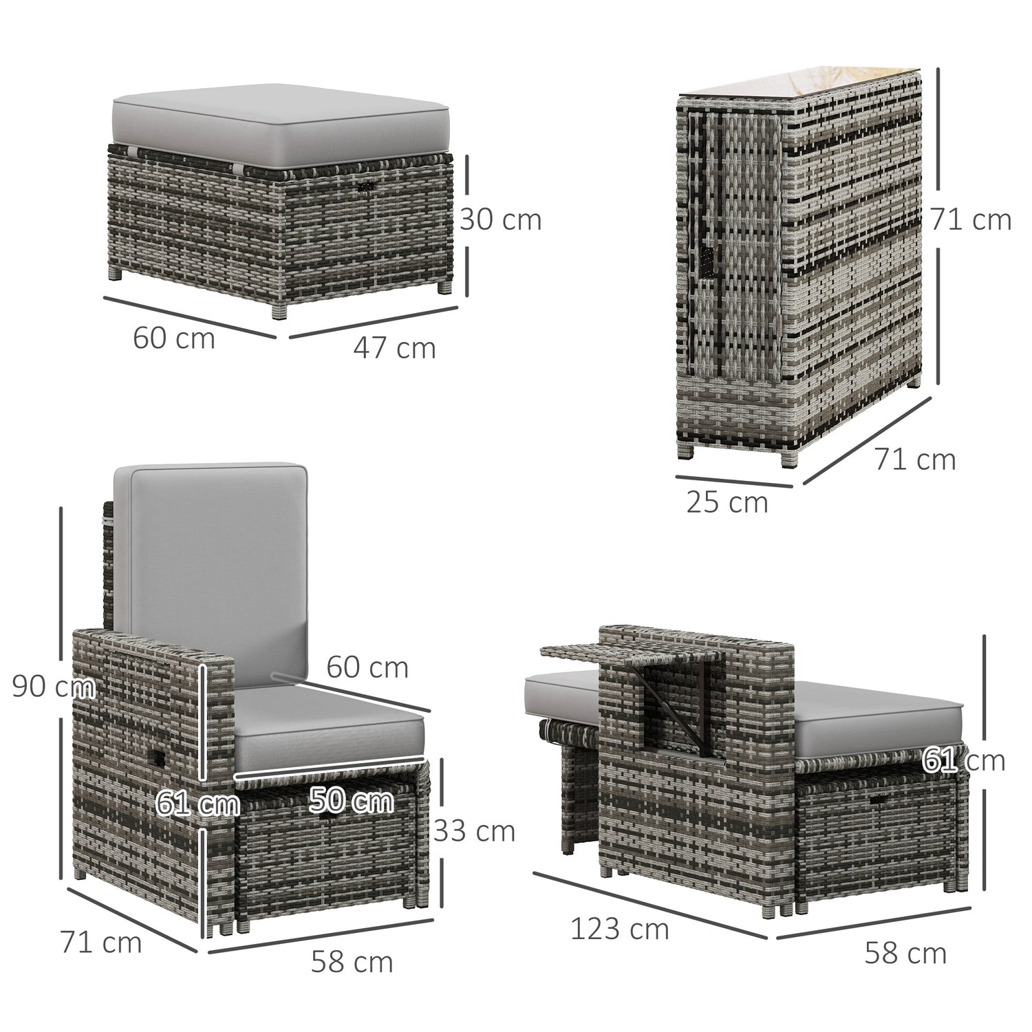 - Dimensions: Chair: 90H x 71L x 58Wcm. Stool: 30H x 47W x 60Dcm, Table: 62H x 71L x 25Wcm. Assembly required.