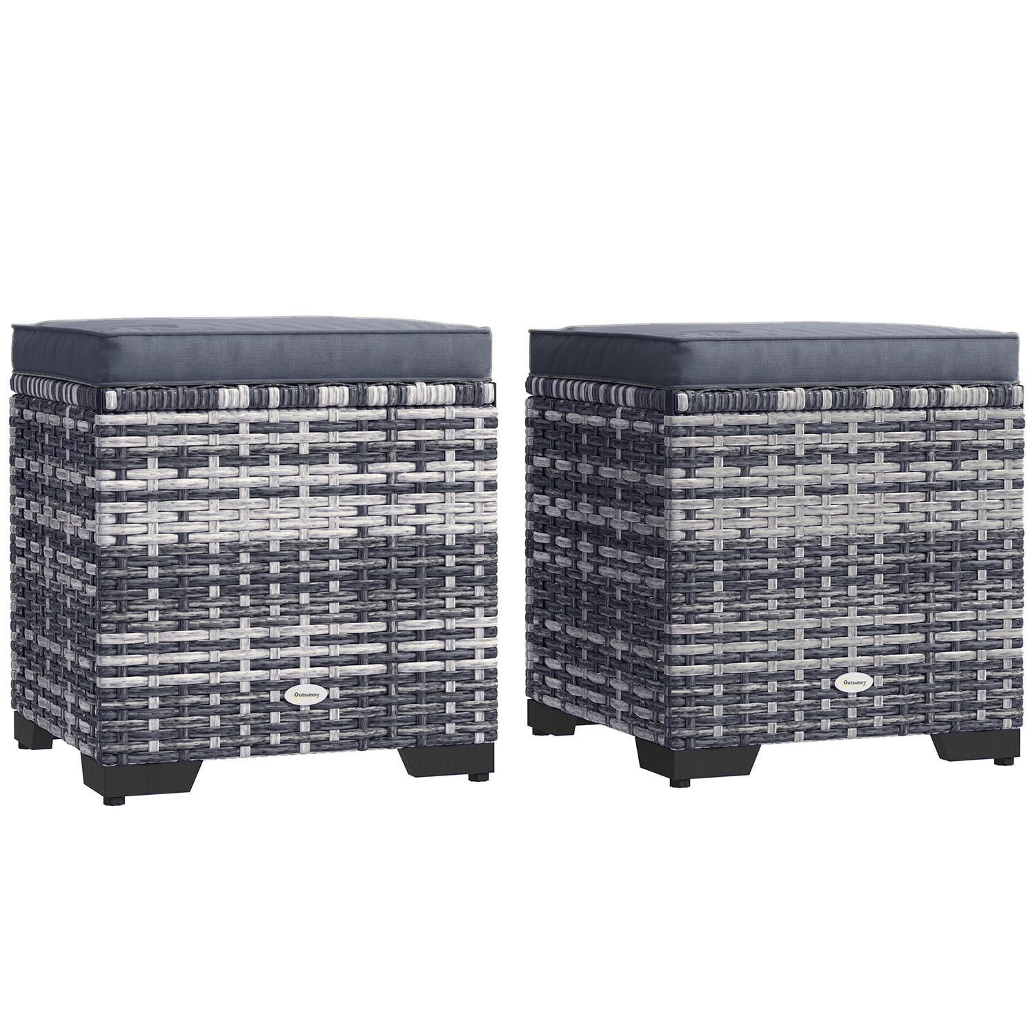 Outsunny Set of 2 Rattan Storage Ottomans, Outdoor Footstools with Removable Cushions for Garden, Balcony, or Living Room, Dark Grey