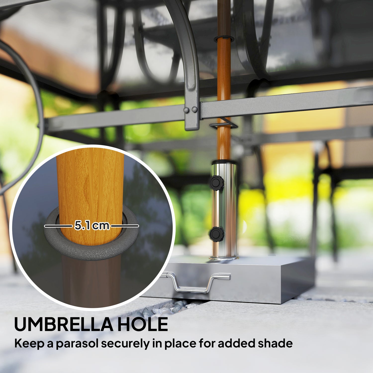 - Tempered glass-top table, with parasol hole: A solid and safe surface to dine from. A beautiful centrepiece to the set, whether standing alone or being used. 51 mm diameter hole for holding garden umbrella, keeping you safely shaded.