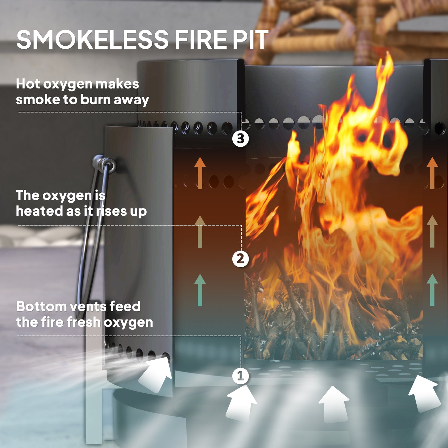 - Smokeless two-part combustion system: Oxygen travels through the bottom vent holes, as warm oxygen channels between the walls - fire burns strong. Also means fuel burns down to ash in this fire pit - no smoke.