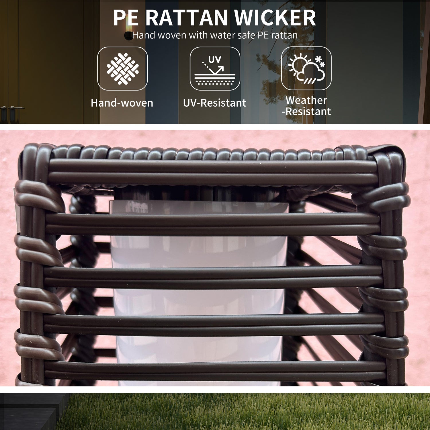 - Metal, wrapped in rattan: Powder coated for strength. Plastic wicker for style. IP44 rating.