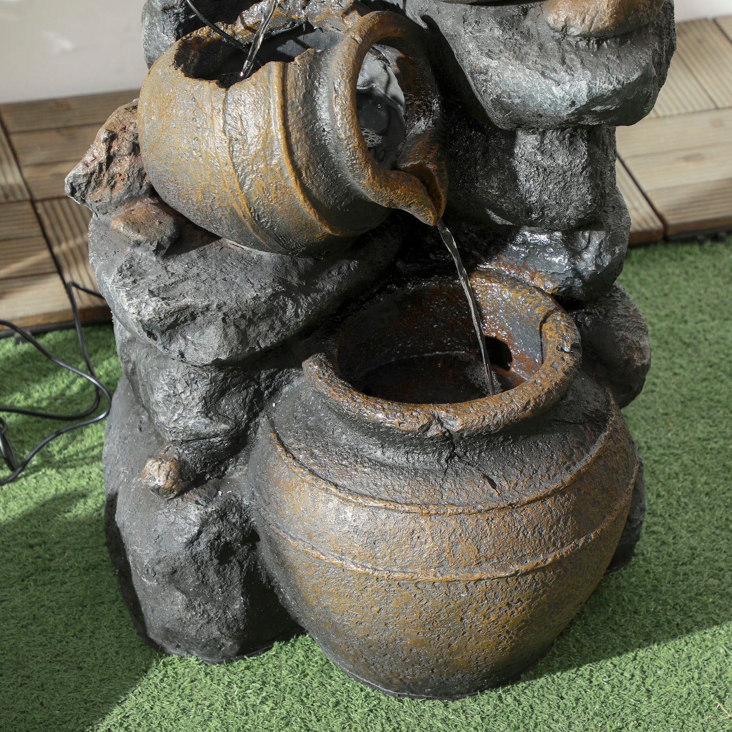 Enhance your garden with this 4-tier garden water fountain, a great choice for decoration. Its realistic look is well-suited for rustic or Zen gardens. The included pump guarantees an independent water circulation, maintaining a constant flow of gurgling water. Additionally, the waterfall fountain features LED lights at 3 levels, illuminating the trickling water and creating a captivating atmosphere. Add natural beauty to your space by using the cascading broken jars and natural stacked stones.