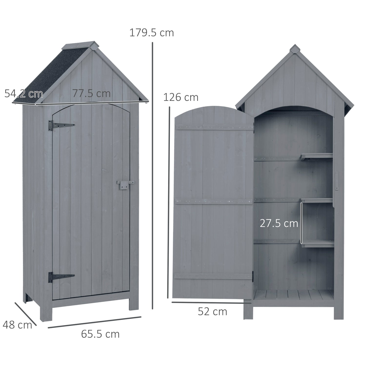 - Dimensions: 77.5L x 54.2W x 179.5H cm. Eaves height: 137.5 cm. Weight capacity: 10 kg (each shelf), 25 kg (floor).