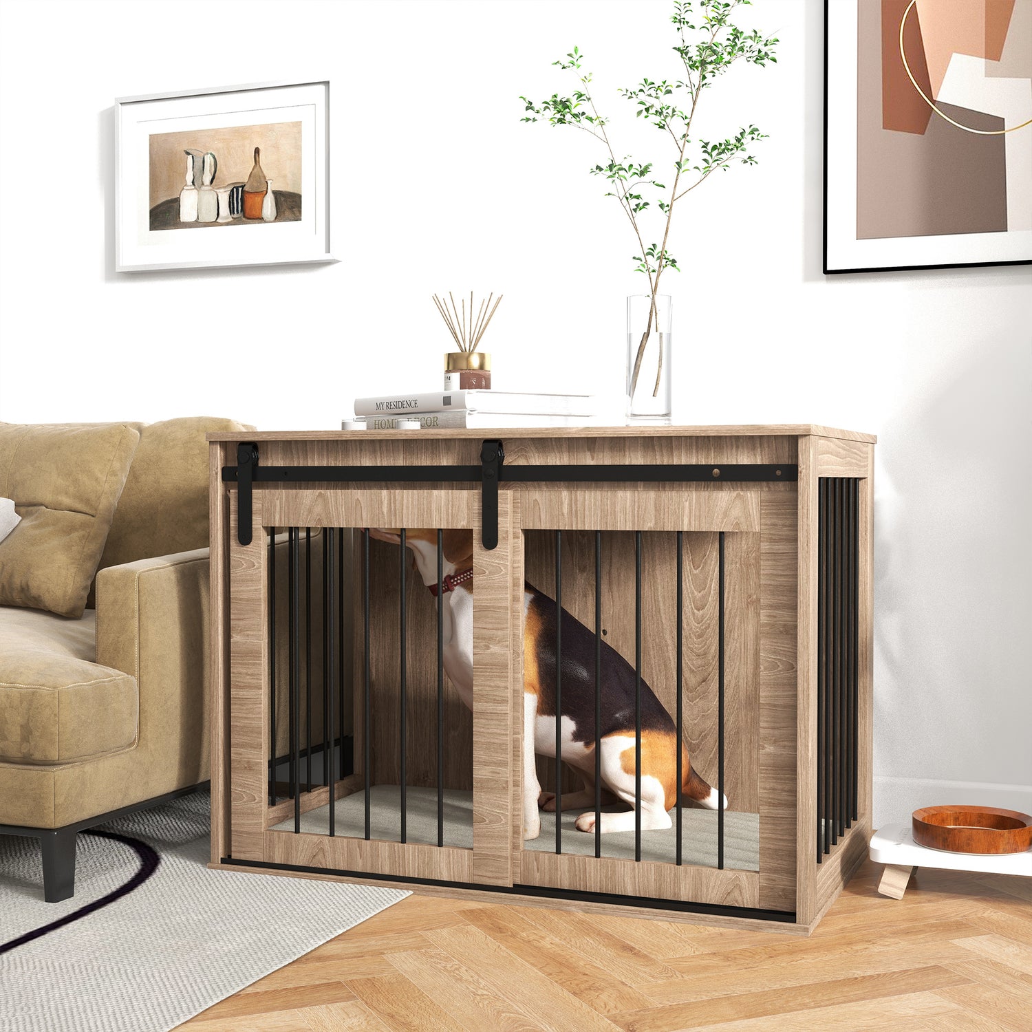 - Durable and secure: Constructed from particle board and steel, this dog crate is built for stability and daily use, featuring a sliding door with a latch for added security.