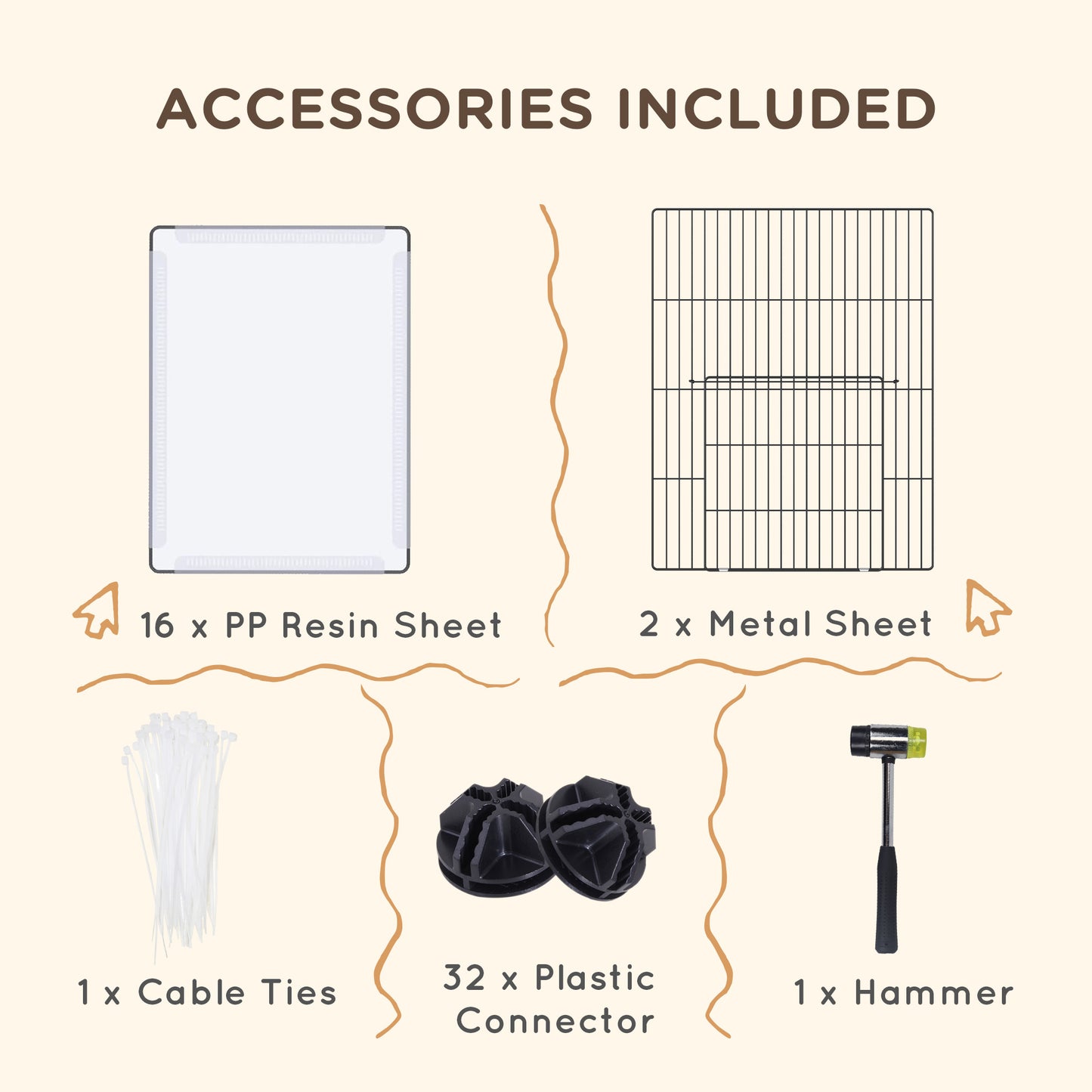 - Accessories included: It comes with 18 panels, 32 connectors, a hammer and zip ties, making assembly quick and easy. Create the perfect animal pen for guinea pigs, hedgehogs and other small animals.