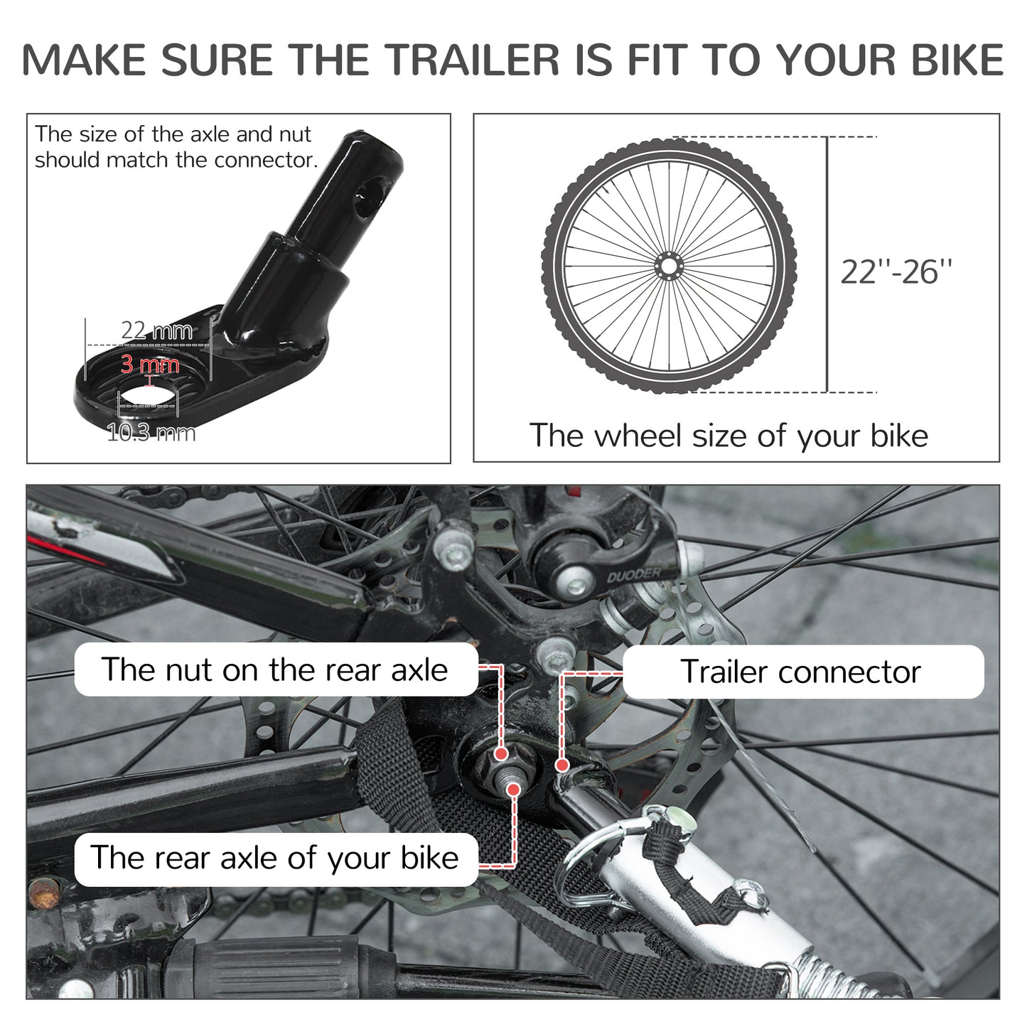 - Dimensions: Trailer: 90H x 170L x 77Wcm. Stroller: 90H x 120L x 77Wcm. Cabin: 63H x 85L x 62Wcm. Recommended bike wheel: 22-26 inches. Assembly required.