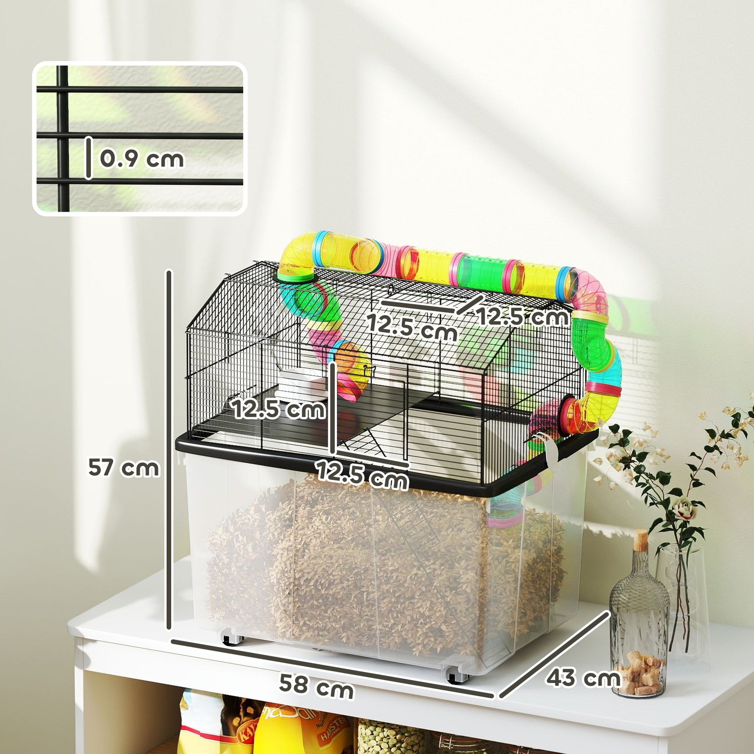 PawHut 2 Tier Hamster Cage with 31cm Deep Tray, Tube System, Water Bottle, Ramp, Feeding Bowl, 58 x 43 x 57cm, Multicolour