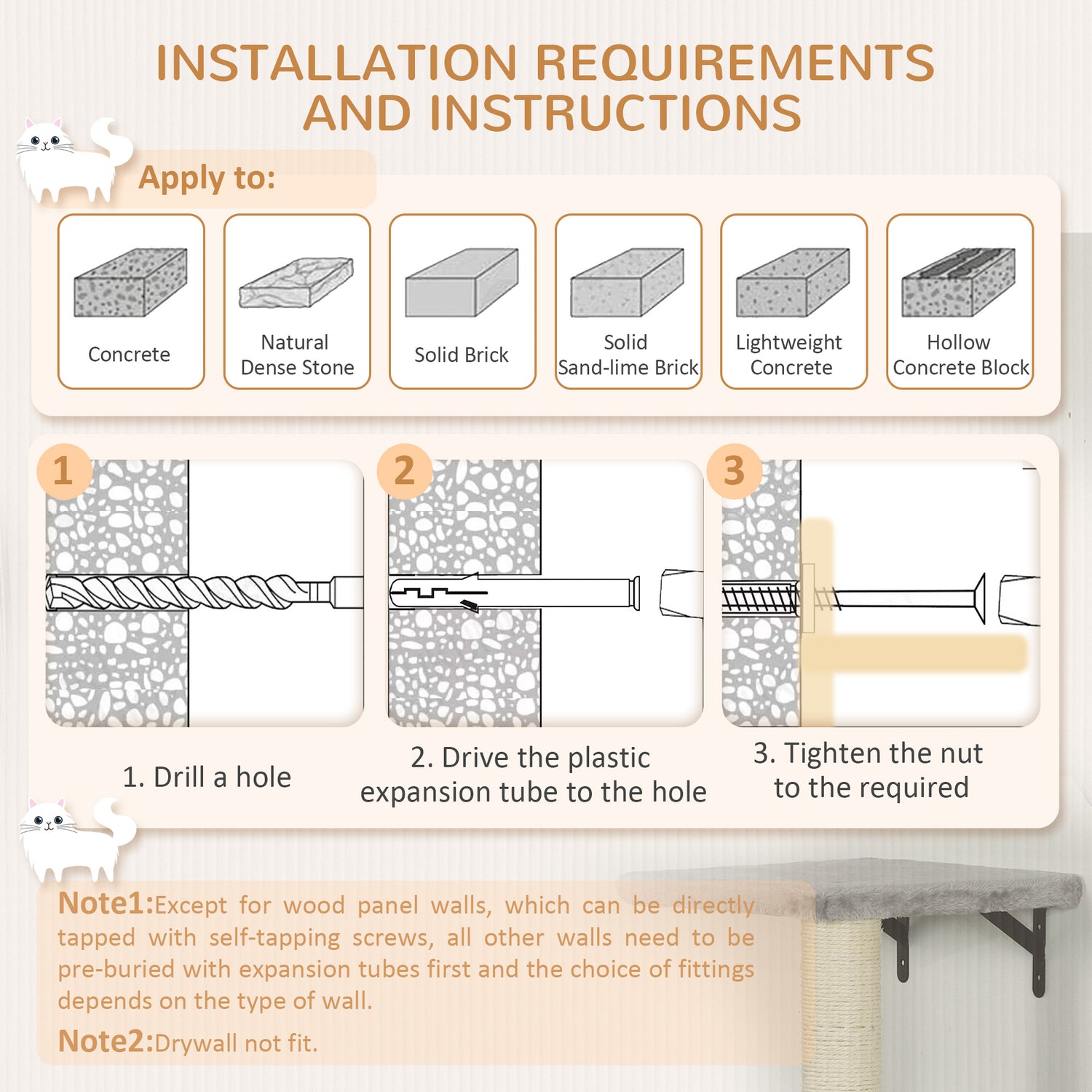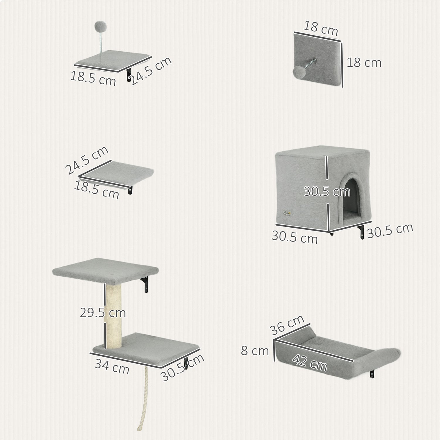 PawHut 6-Piece Cat Wall Shelves Set with Condo, Cat Wall Furniture with Platforms, Sisal Scratching Post, Bed, Toy Ball, Grey