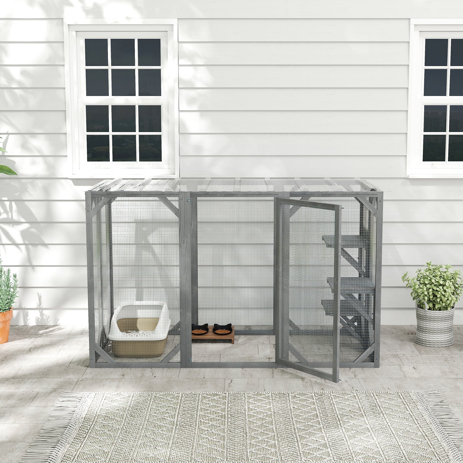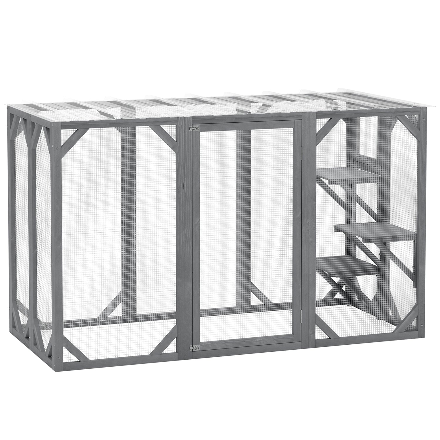 PawHut 71" Outdoor Wooden Cat House with 3 Platforms, Large Door and Weatherproof Roof, for Multiple Cats, Grey