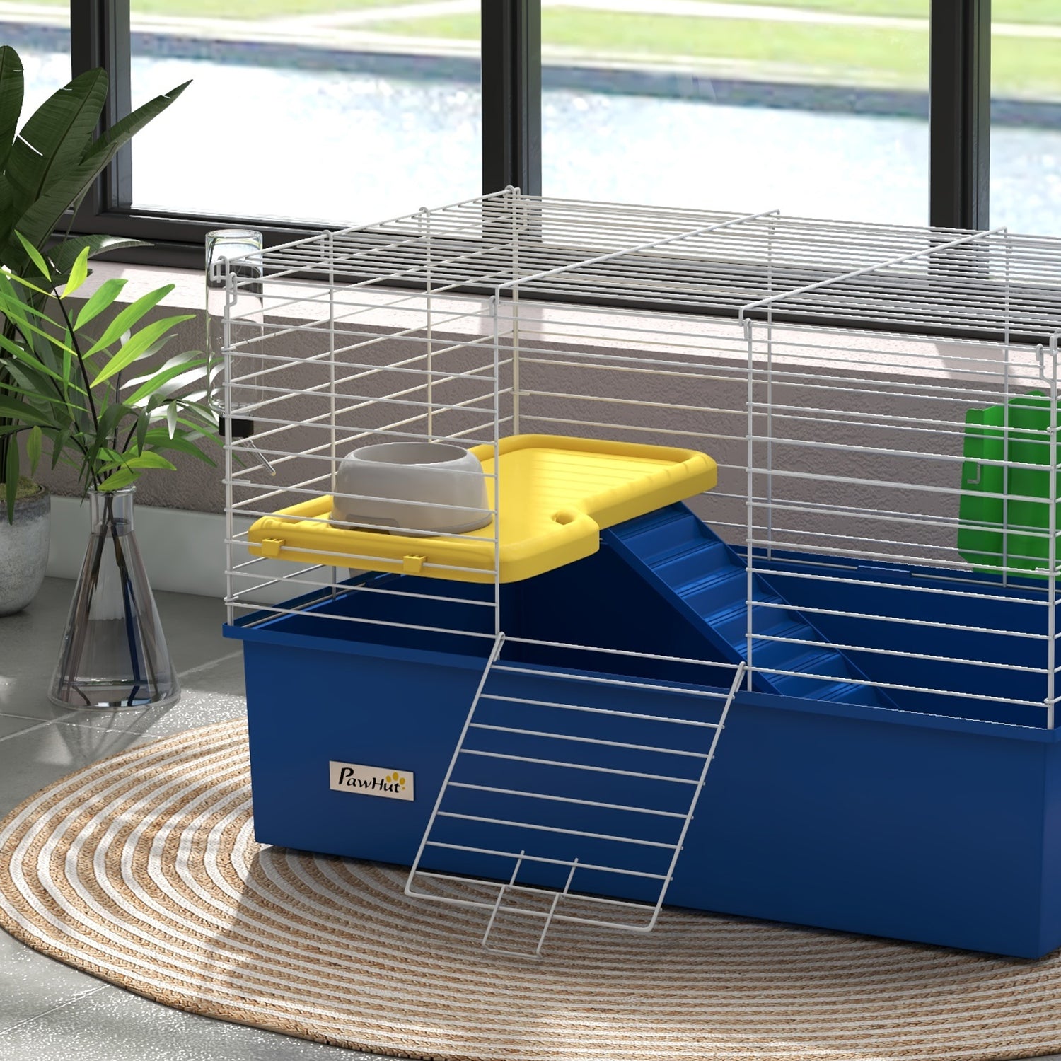 Watch pets thrive in this PawHut cage – a wonderful home for small animals. A colourful safe haven, it's made with a cosy living area, protected by metal wire caging, keeping them safely inside and allowing air to flow through. Inside features a small platform with a food bowl, a water bottle, a ramp and a hay feeder, providing everything they need. Plus, there's a deep base, which collects dirt and debris, keeping their space clean and comfortable. Give your pets the home they truly deserve.