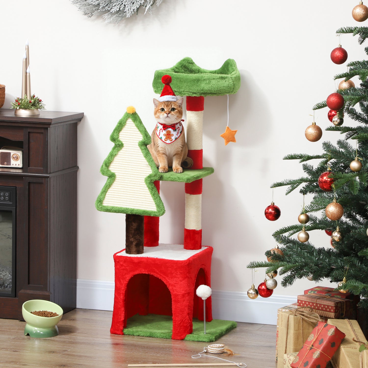 PawHut Christmas Cat Tree, 120cm Cat Tower with Scratching Post & Board, Platform, Toys, Green