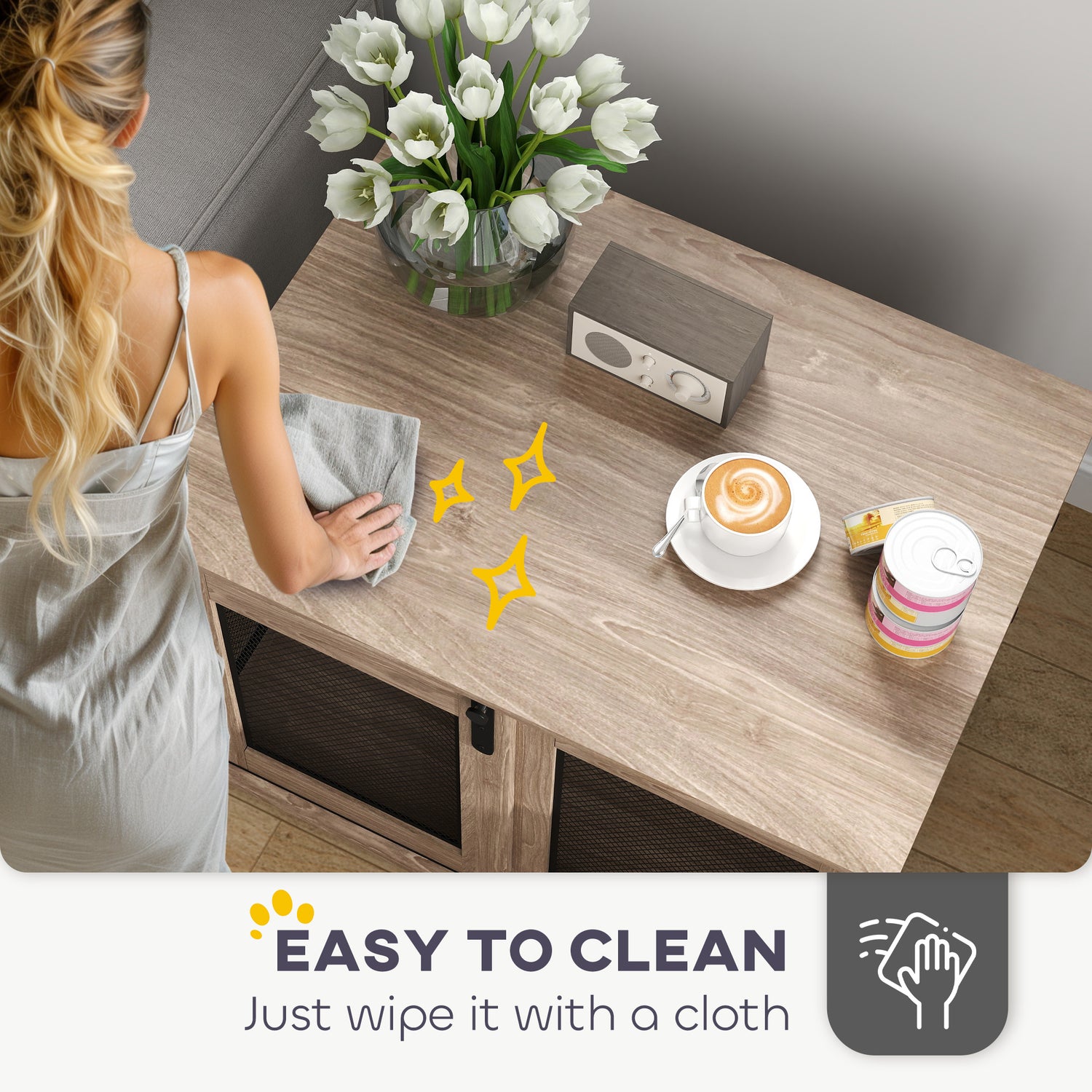 - Robust and pet-safe design: Built from particleboard and reinforced with a chew-resistant dense mesh grid, this dog crate furniture is designed to withstand daily use, ensuring it remains a reliable and safe space for your pet.