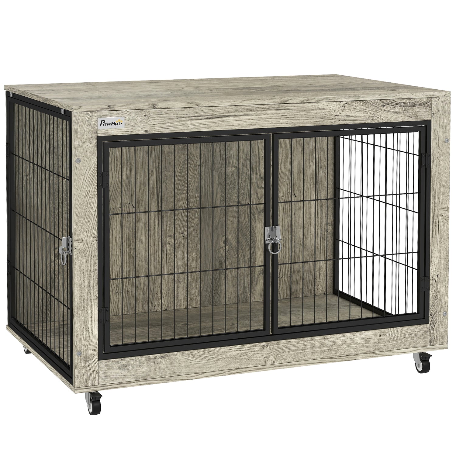 PawHut Dog Crate Furniture with Wheels, Double Doors, for Large Dogs, 100 x 60 x 73.5cm, Grey