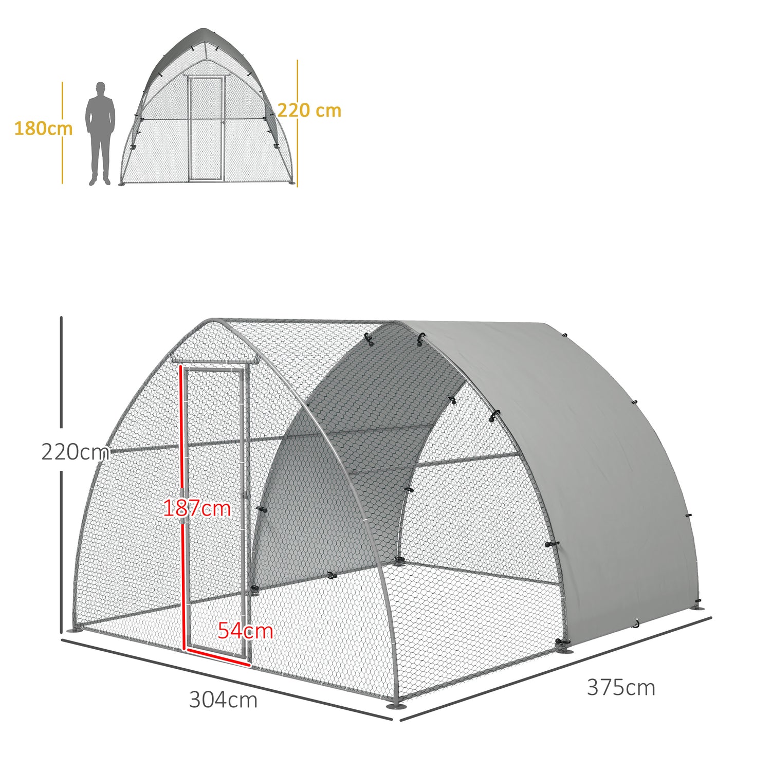 - Overall dimensions: 2.2H x 3.04L x 3.75Wm. Canopy: 5.6L x 1.85Wcm. Door: 1.87H x 0.54Wm. Mesh: 4.5L x 2.5Wcm. Area: 11.37m²