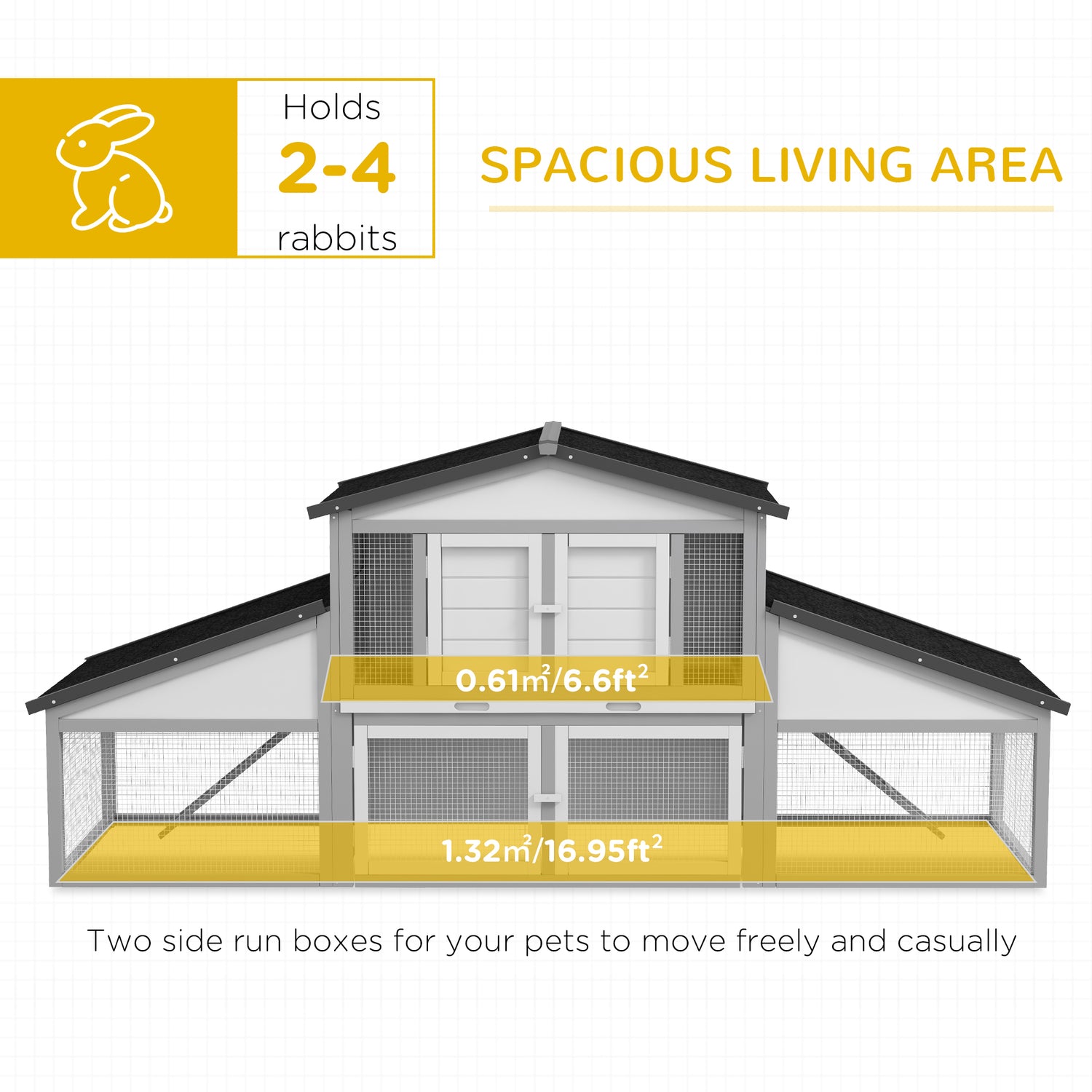 - Spacious rabbit hutch: With 225cm of space from end to end, pets have lots of distance to play, hop and run. Includes two ramps that are connected to the rabbit house, providing a private and sheltered place to relax in comfort.
