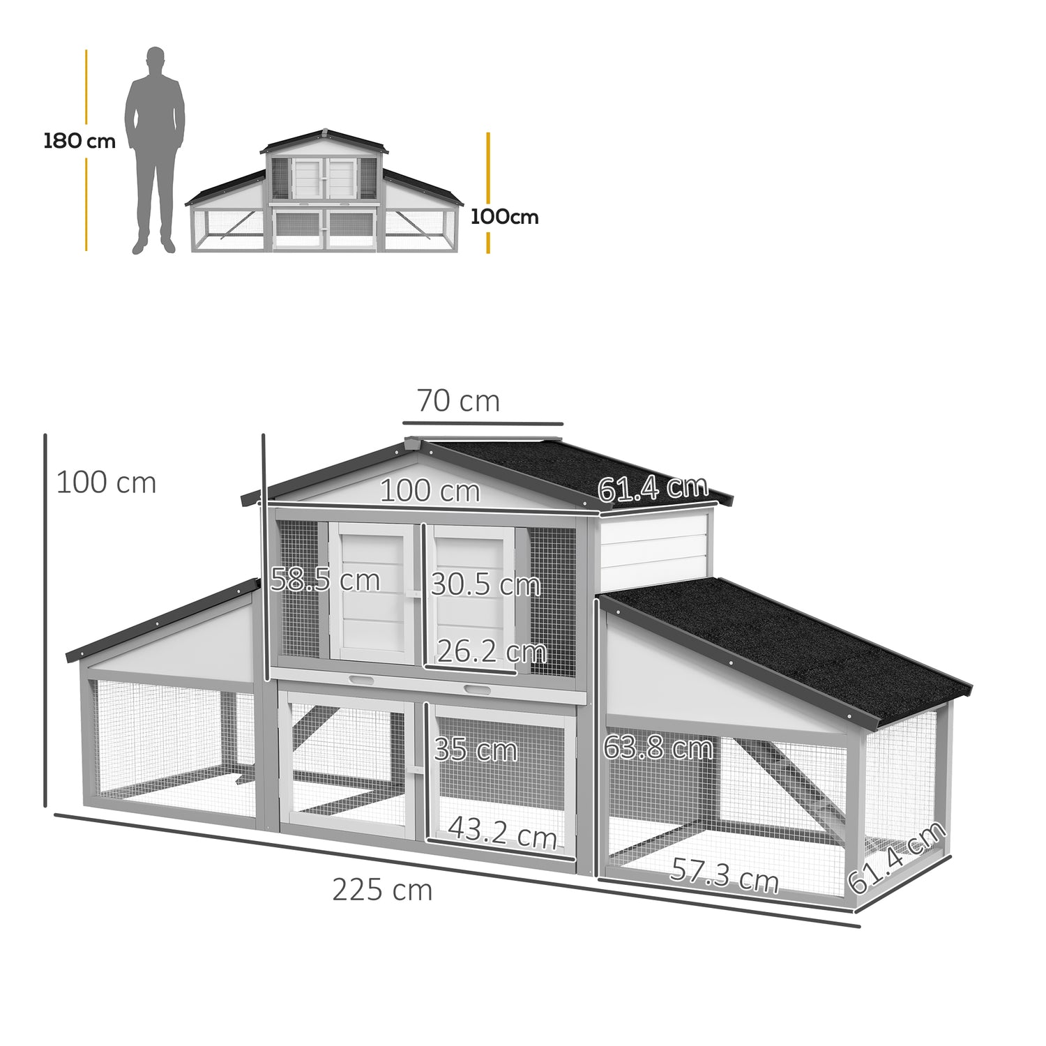 - Dimensions: 100H x 225L x 70Wcm. Main house: 58.5H x 100L x 61.4Wcm. Suitable for 2-4 small to medium rabbits. Assembly required.
