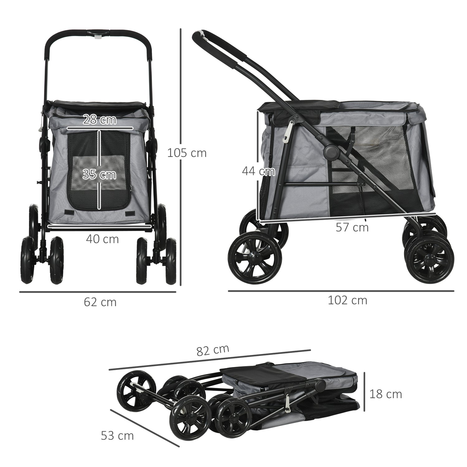 PawHut One-Click Foldable Pet Stroller, Dog Cat Travel Pushchair w/ EVA Wheels, Storage Bags, Mesh Windows, Doors, Safety Leash, Cushion, for Small Pets - Grey