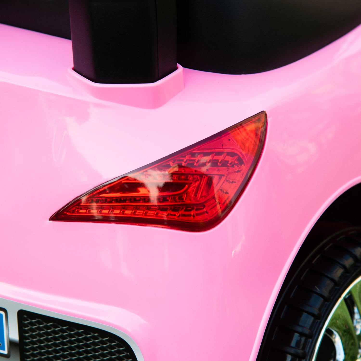 - Realistic design: Stylish black body, number plate and snazzy rims resemble a real car. Also features flashing headlights and music.