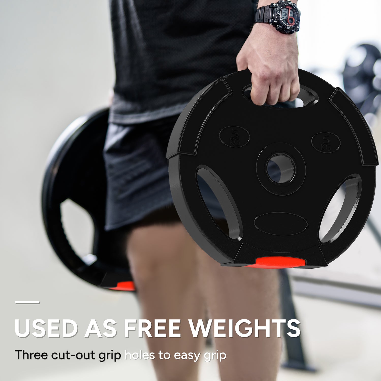 Build strength and stay active with the SPORTNOW weight plate set! It includes two 10kg and two 5kg plates, each with a 2.5cm centre hole to fit standard barbells with ease. Designed with three grip holes, they're great for barbell-free exercises too, so you can switch up your routine. The tough polypropylene cover helps protect your floors from drops, so you can train confidently, wherever you lift.
