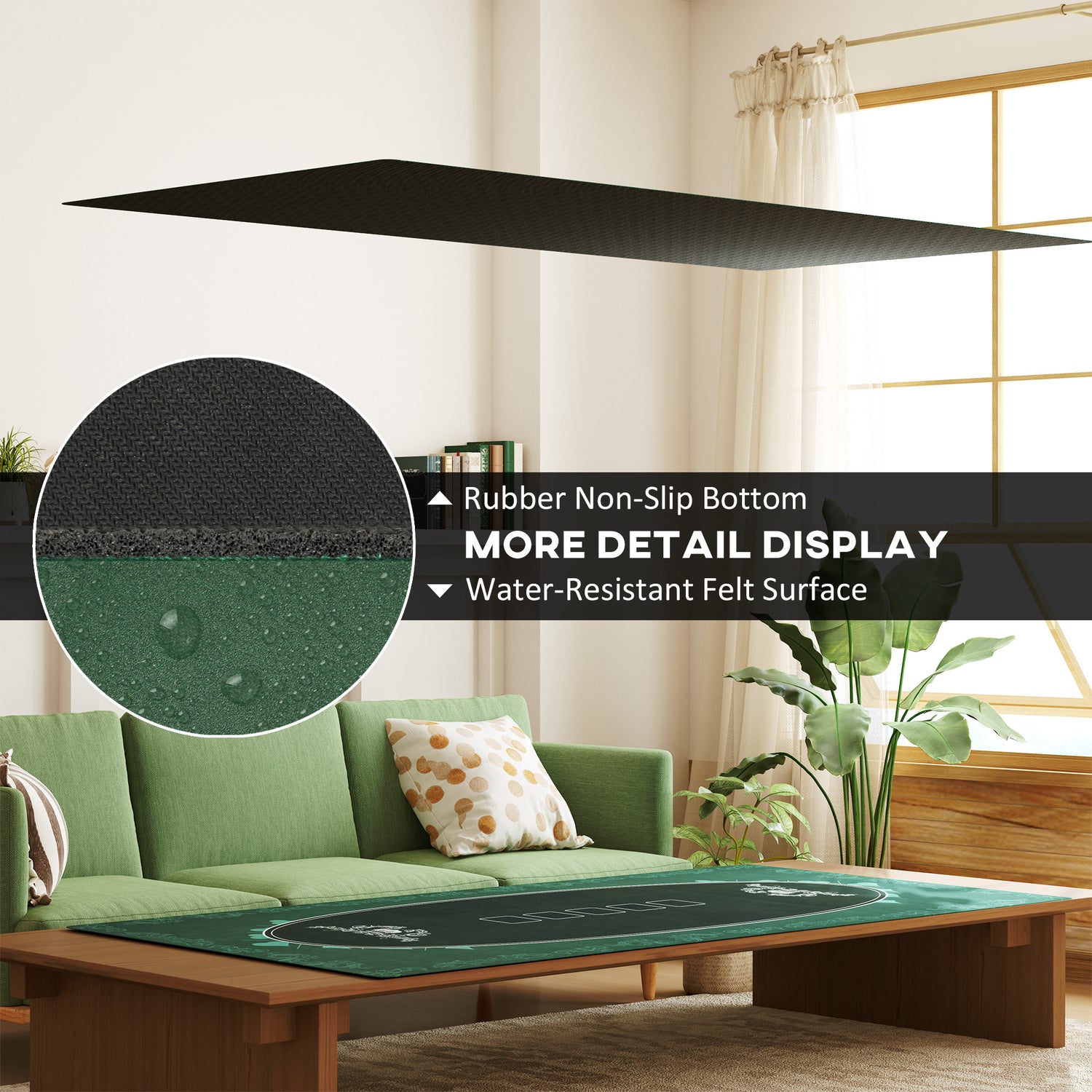- Comfortable surface: The poker table cloth features a felt surface that keeps cards sliding smoothly without slipping off the mat