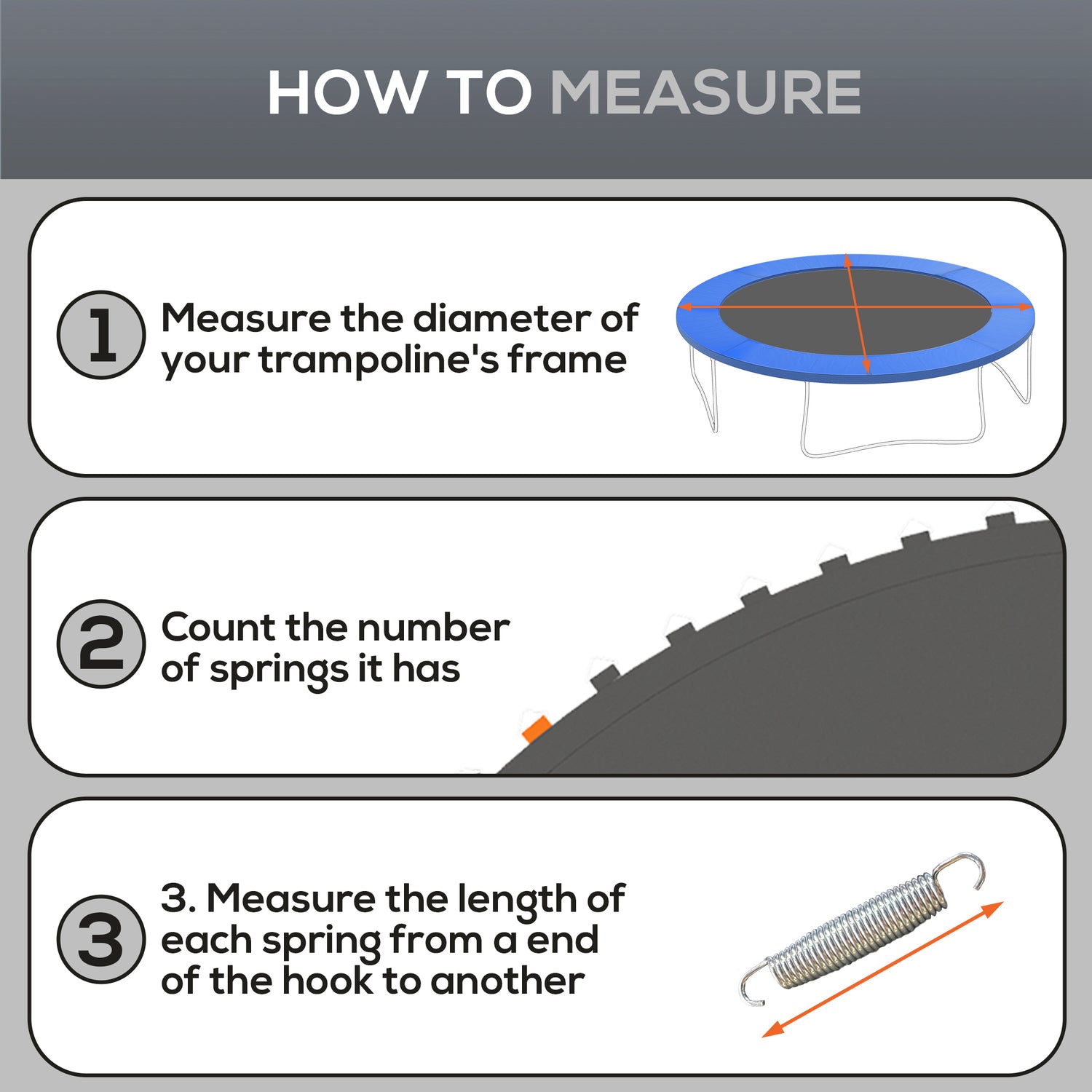 - Easy to measure: First, measure the diameter of your trampoline's frame. Next, count the number of springs it has. Finally, measure the length of each spring from one end of the hook to another.