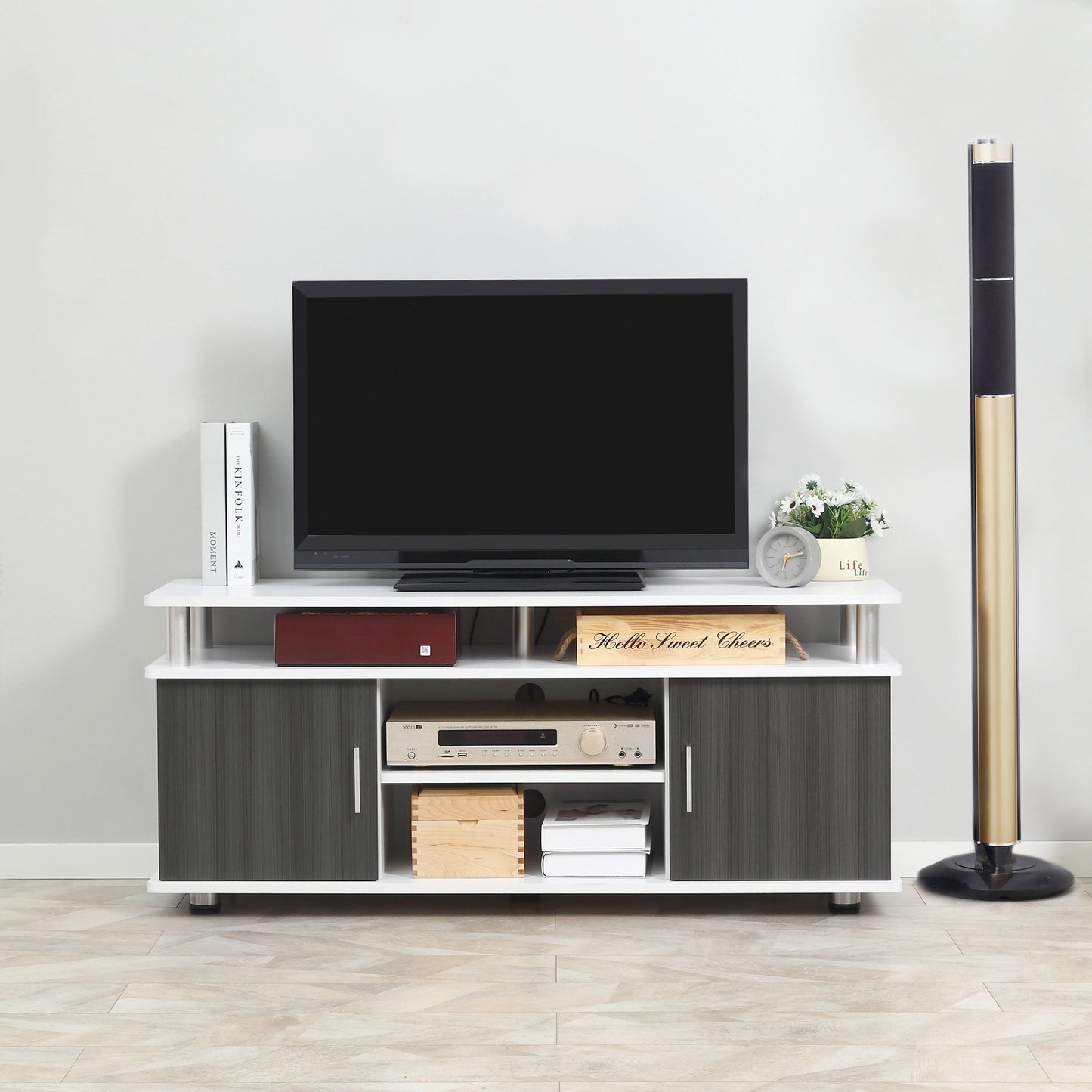- STYLISH DESIGN: The clean lines of this TV stand cabinet and the fresh colour and wood grain texture with silver metal accents makes this piece stand out in any room