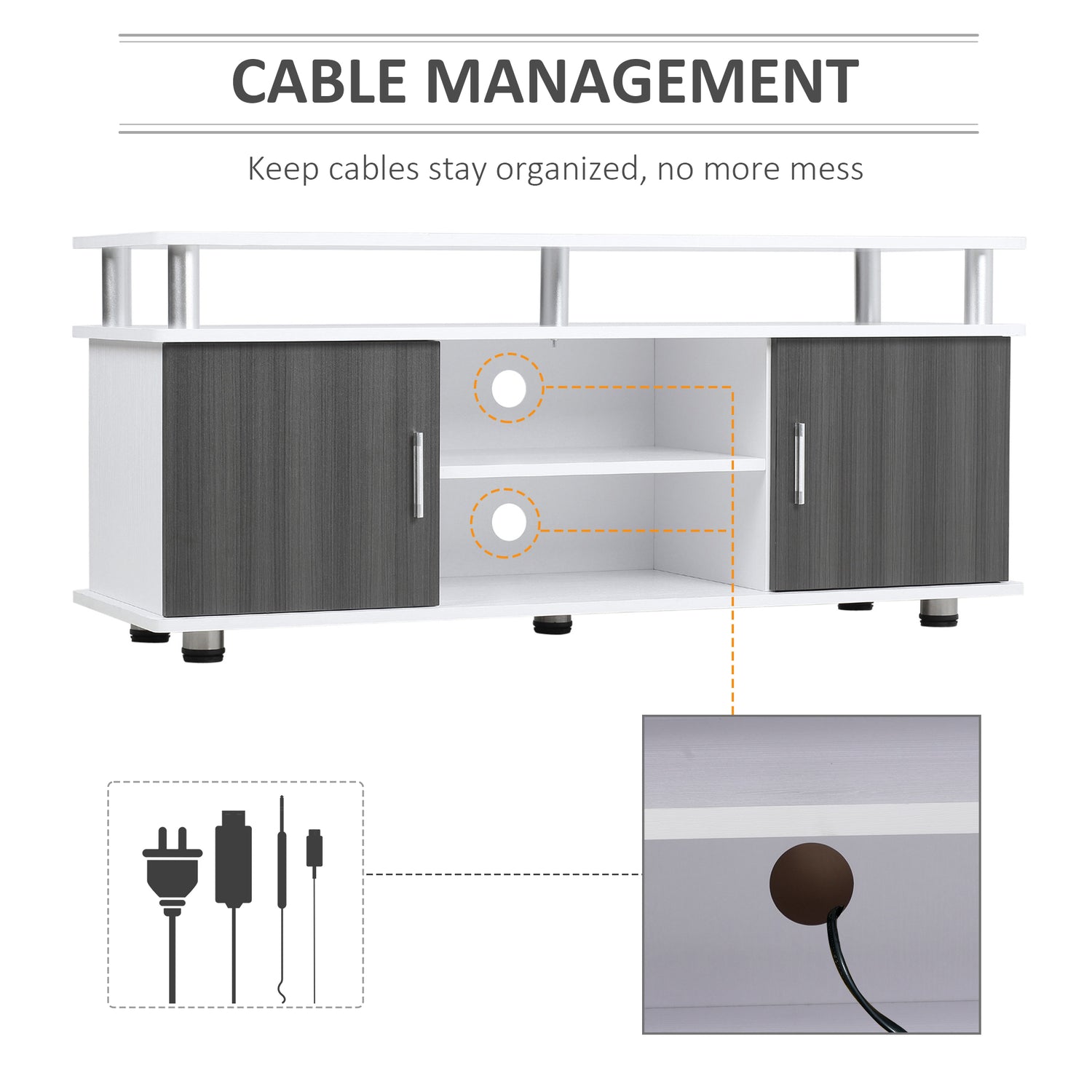 HOMCOM TV unit blends perfectly into your modern, simple lifestyle. It features the large top panel which holds up to 120 cm flat panel TV screen. There are also open display shelves to hold your entertainment equipment and two compartments with doors for your loose stuff such as CDs, DVDs, and games. Designed to be lightweight and space-saving. The cable management system helps you maintain a tidy entertainment space.