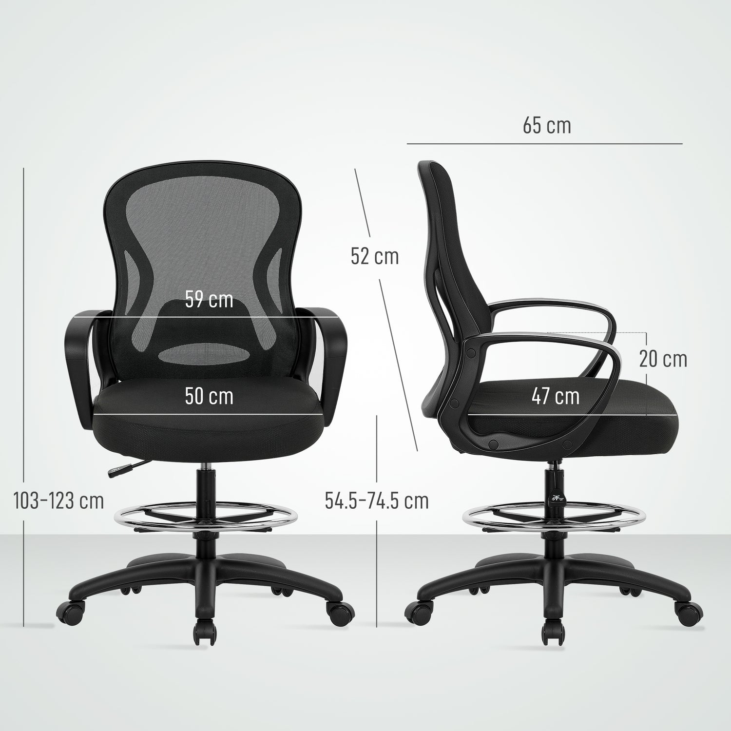 - Overall dimension: 59W x 65D x 103-123H cm. Seat size: 50W x 47D x 54.5-74.5H cm. Weight capacity: 120 kg. Assembly required