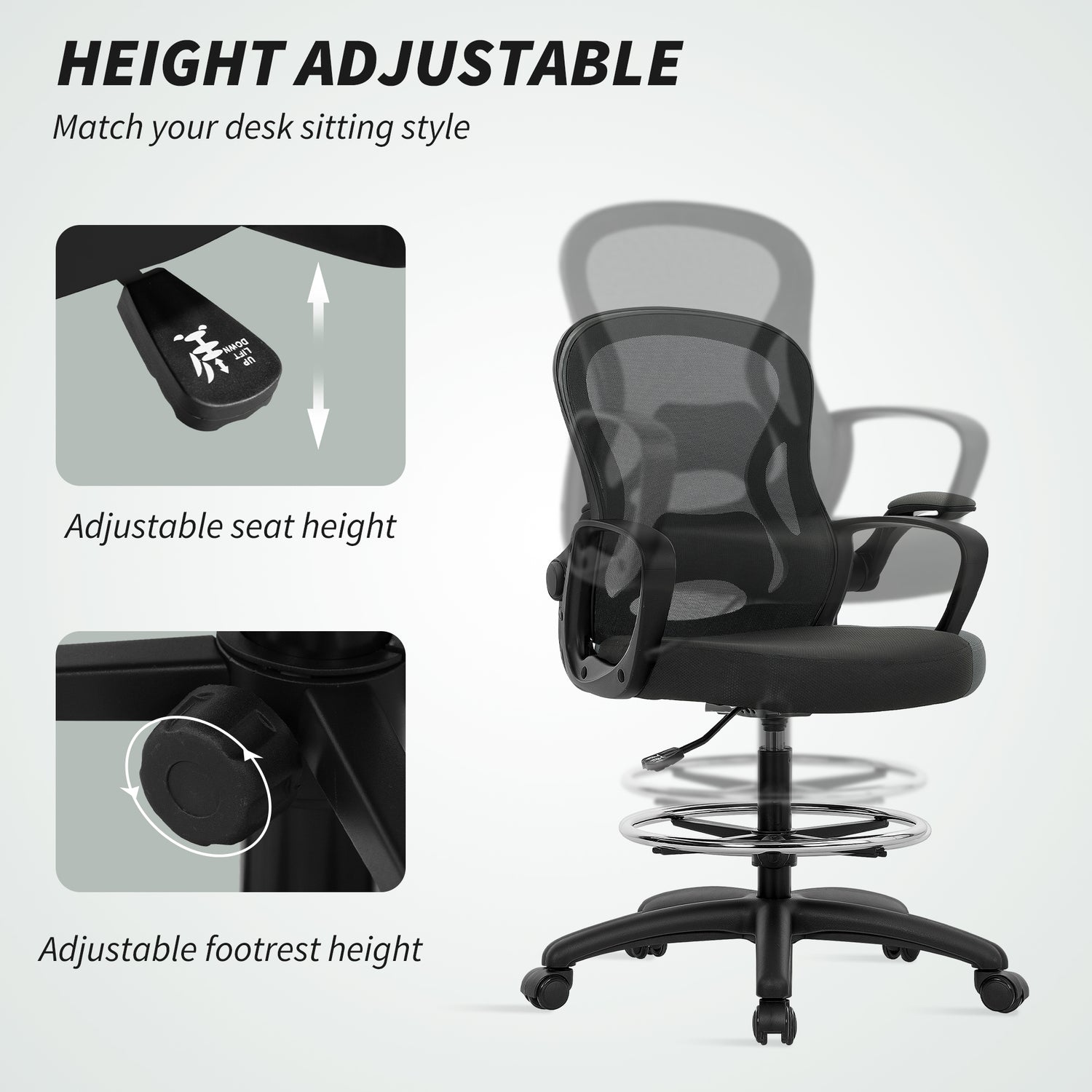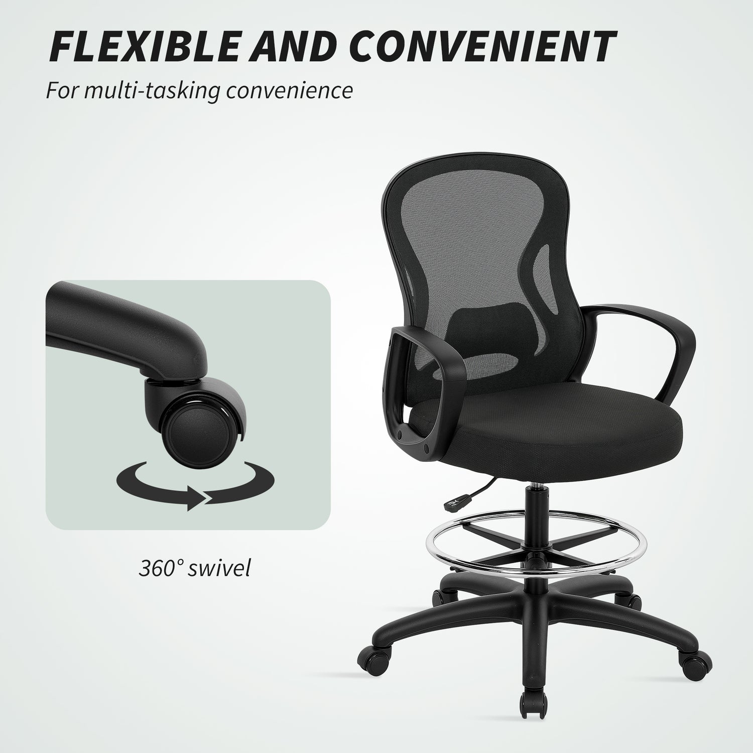 Vinsetto Drafting Chair, Ergonomic Mesh Office Chair with Lumbar Support, Adjustable Height and Footrest for Standing Desk, Black