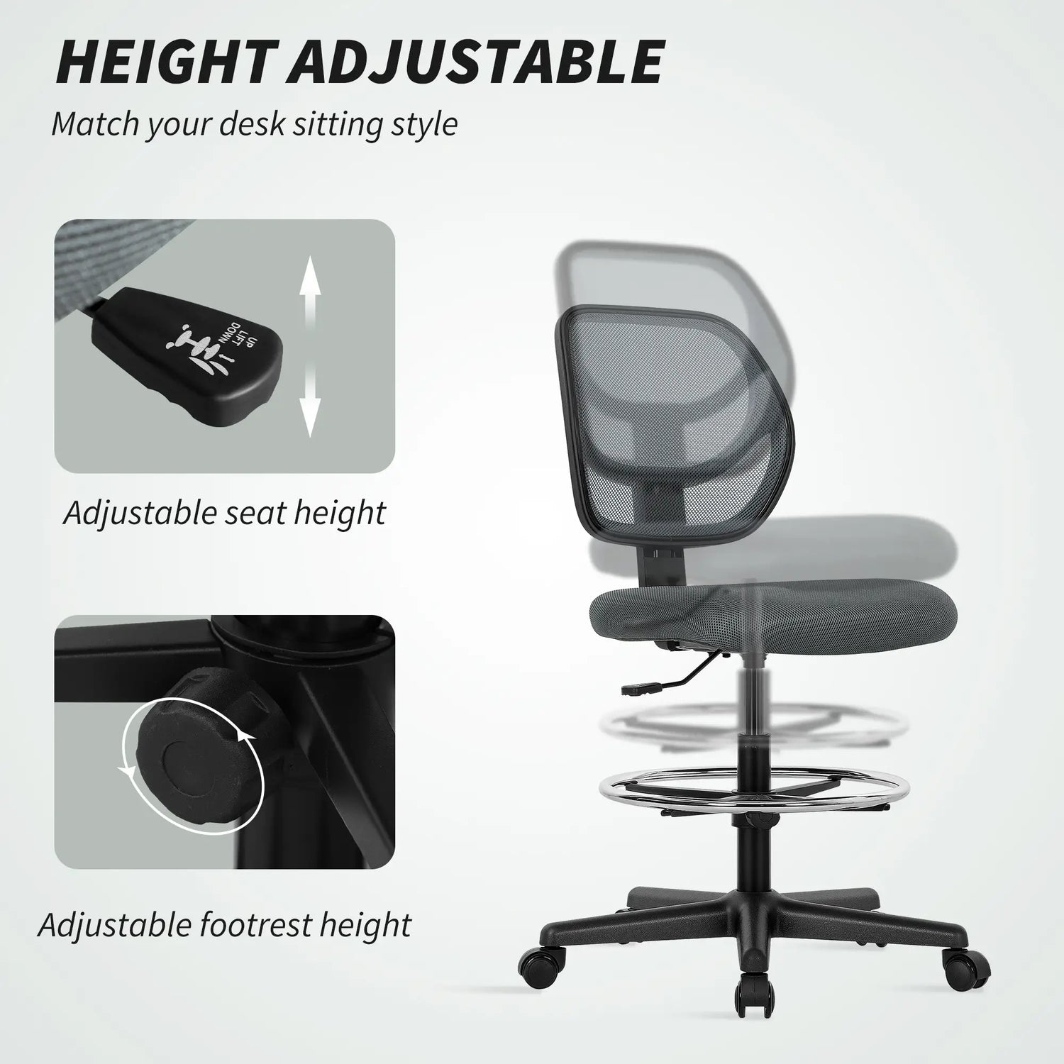 - Adjustable height and footrest: Standing desk chair seat can be set between 50-70cm, great for working at different levels. Bottom bar can also be moved easily too.