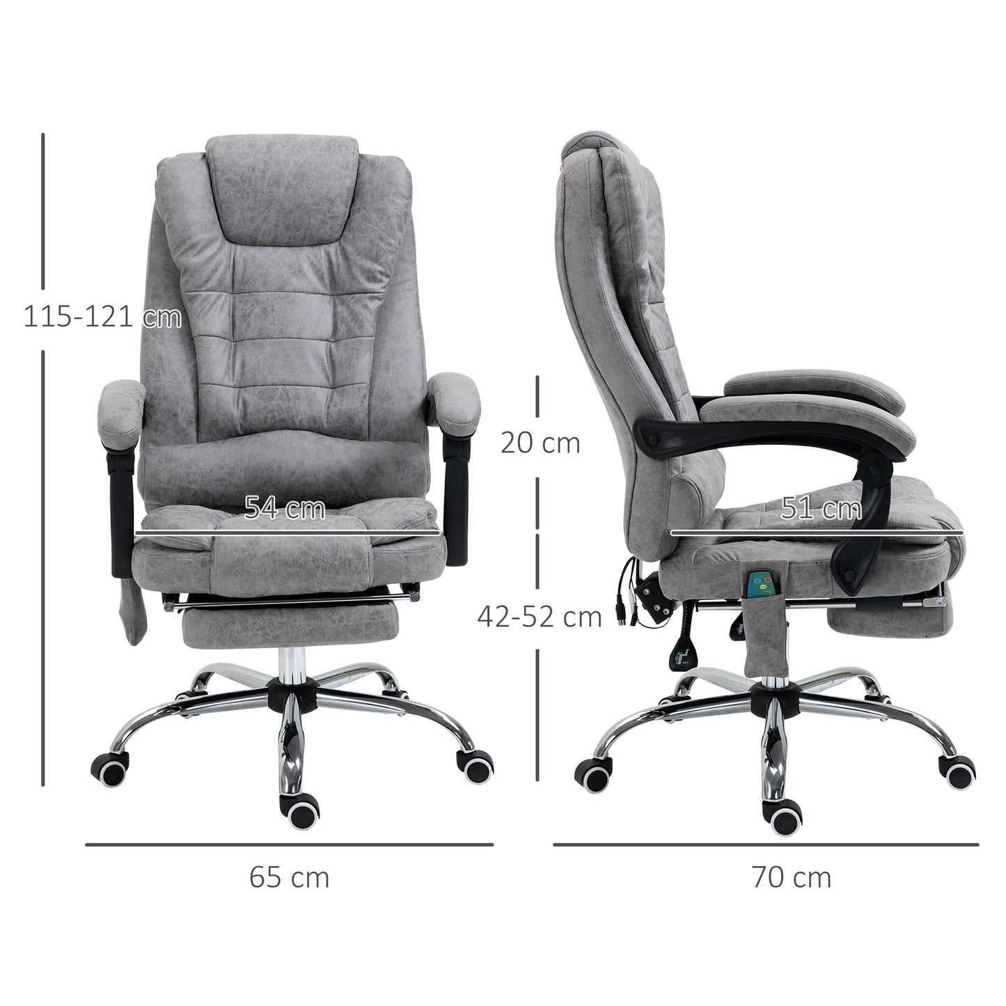 Work and relax, with this Vinsetto massage office chair. Wrapped in smooth and stylish microfibre upholstery, this computer chair is great to sit on and look at! But, most importantly, it has six heated massage points - four on the back, two on the seat: simply turn on the remote and relax. The seat gives wide sitting room, a high back and arms for support. With a 135° reclining backrest, finished with a manual footrest to elevate your lower body with ease.