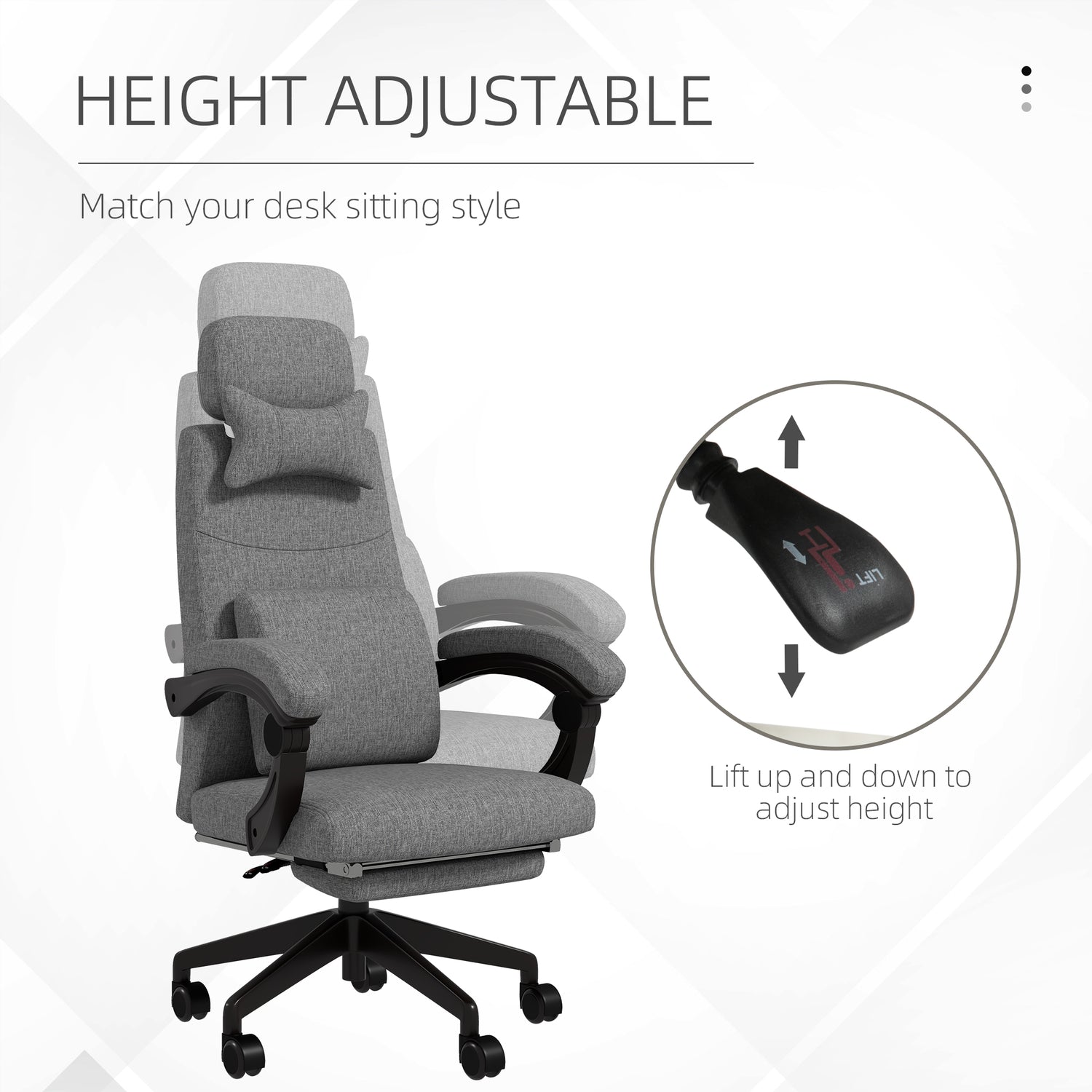 Make working all day comfortable and easy, thanks to this Vinsetto office chair with footrest. The tall back and armrests offer support; the back reclines back to a maximum 160° - paired with the manual footrest, you can rest back and relax whenever. Padded for comfort, it comes with a top and back pillow for extra support and comfort. Complete with five wheels to move this pc chair around easily.
