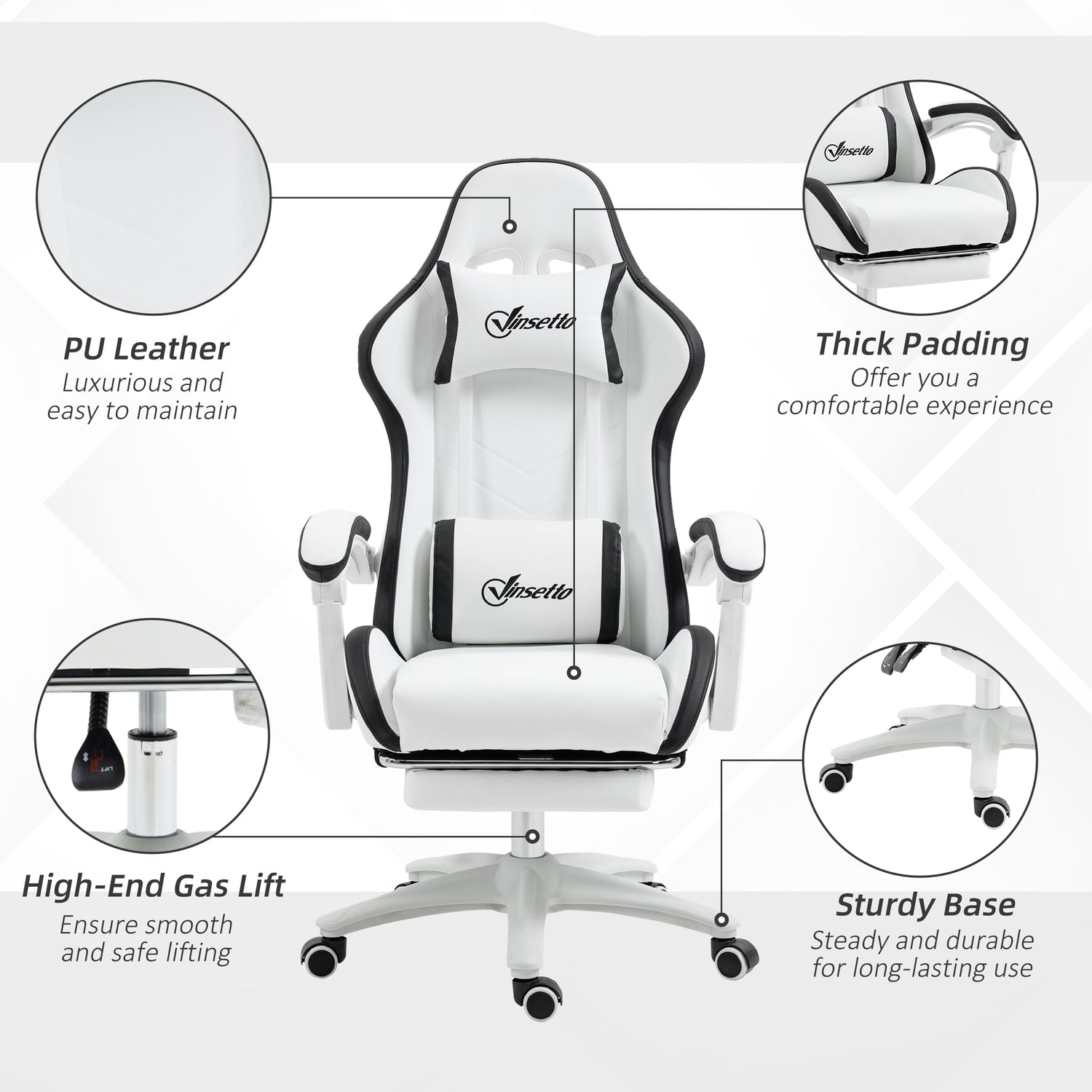 Vinsetto Racing Gaming Chair, Reclining PU Leather Computer Chair with 360 Degree Swivel Seat, Footrest, Removable Headrest and Lumber Support, White and Black
