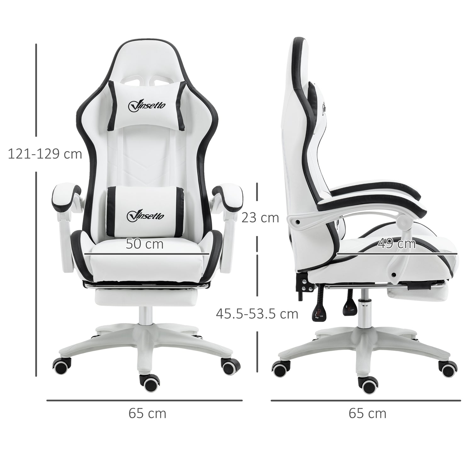 Keep comfortable and focused in the game: do it with this Vinsetto gaming chair. Faux leather upholstery is sleek, with a coloured border all over for a touch of impact. Padded all over, with head and lumbar pillow included for comfort. The back reclines to a maximum 135°, with a pull-out footrest to elevate the lower body. Adjust the height between 45.5cm and 53.5cm, to game at a position best for you.