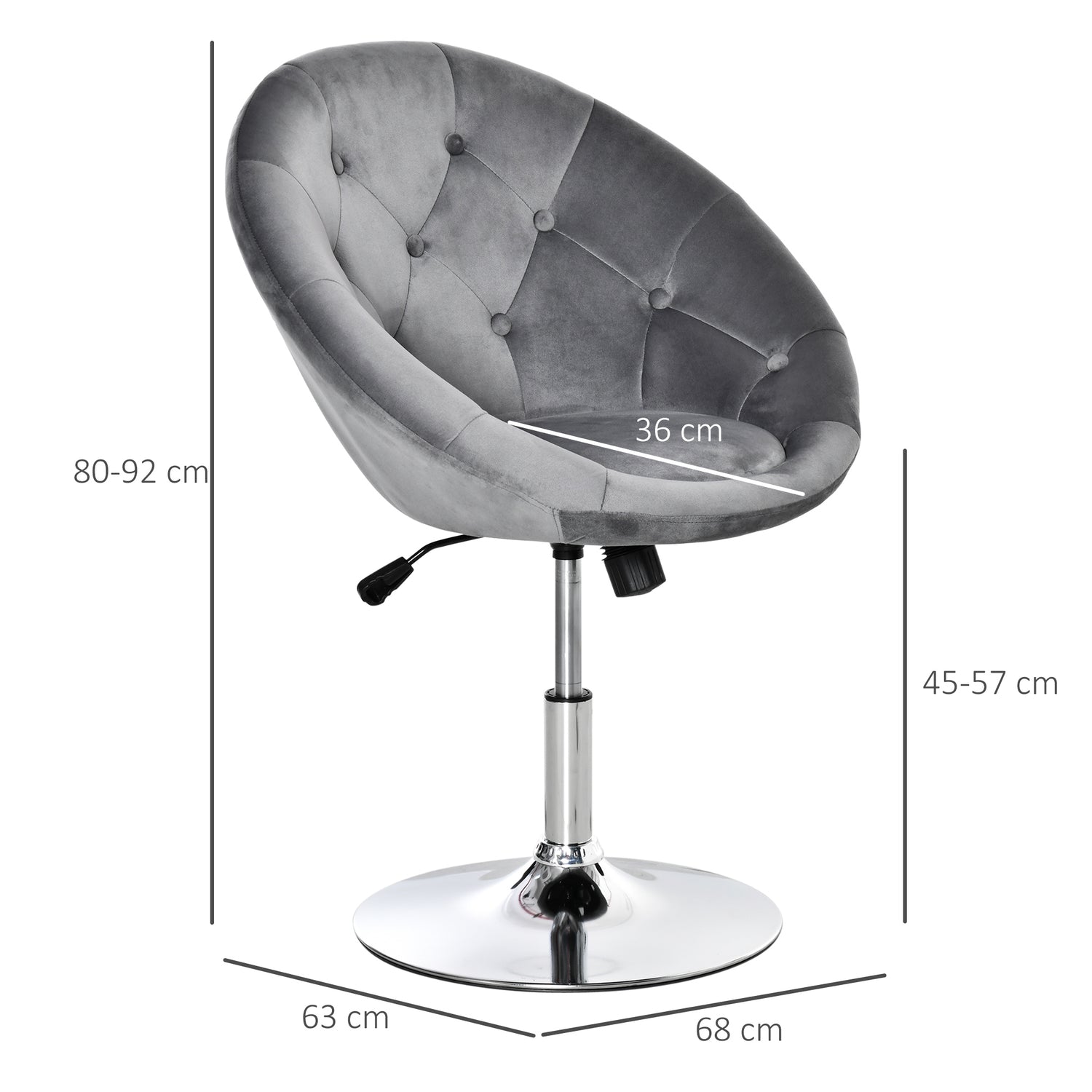 - Dimensions: 78-90H x 71W x 59Dcm. Seat: 42-54H x Ø36Wcm. Base: Ø45cm. Maximum load 120kg. Assembly required.